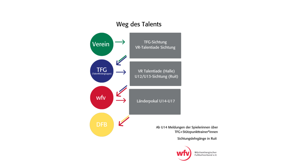 Der wfv hat seine Talentfördergruppen (Förderung im Alter U12/U13/U14) an 12 Standorten in Württemberg. In den somit insgesamt 12 Talentfördergruppen arbeiten qualifizierte Trainerinnen und Trainer regelmäßig mit den Talenten. Im U14 Jahrgang trainieren die Mädchen, welche an den DFB-Stützpunkten sind, nicht mehr an den Talentfördergruppen. In den DFB-Stützpunkten können die Mädchen bis zur U16 weiterhin gefördert werden.