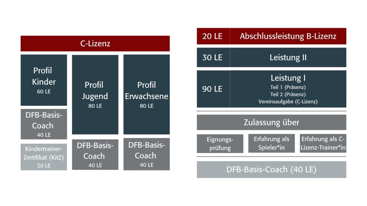 Ob auf Kreisebene oder in der Bundesliga, ob für Jugend- oder Erwachsenenmannschaften: Es gibt für jeden Trainer und jede Trainerin das passende Ausbildungsangebot. Startpunkt für alle Trainerinnen und Trainer ist der DFB-Basis-Coach. Auf Landesverbandsebene werden darauf aufbauend die C-Lizenz und B-Lizenz ausgebildet. Höhere Lizenzen müssen direkt beim DFB absolviert werden.