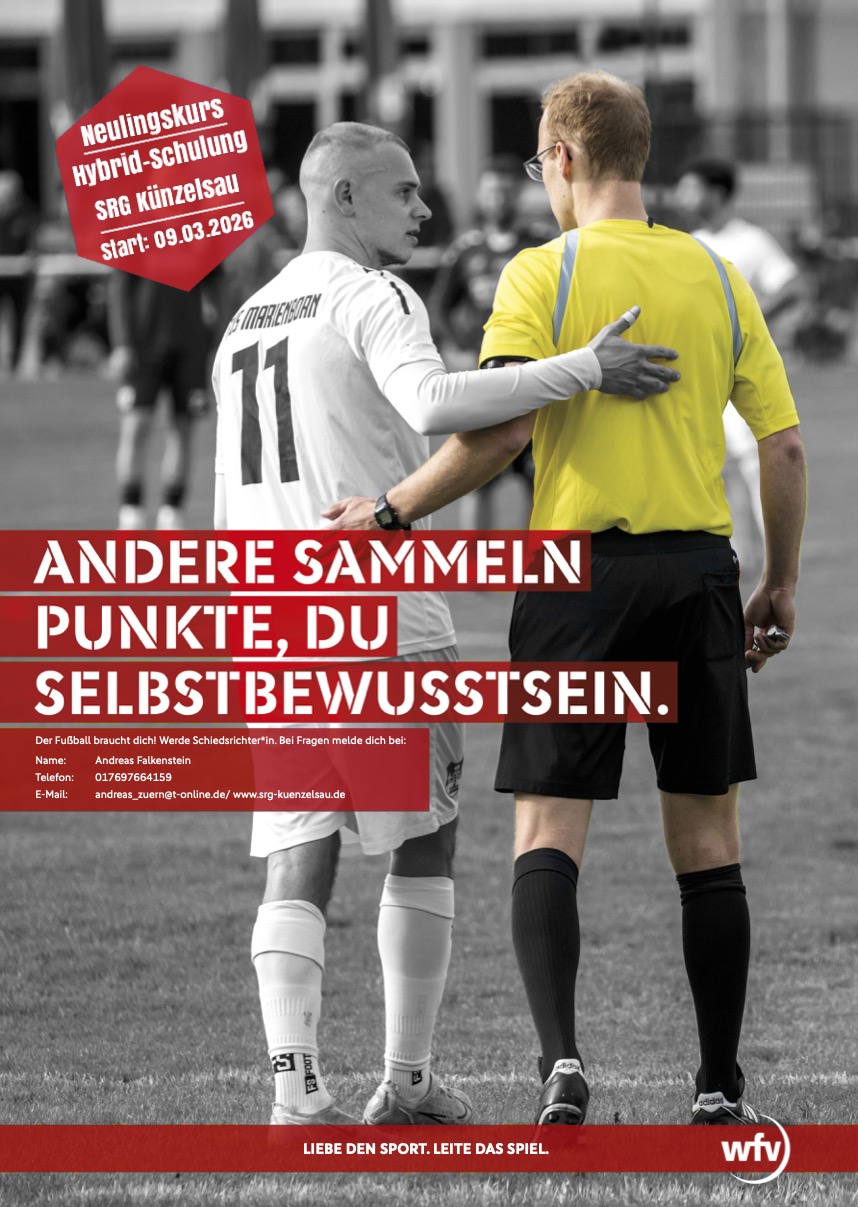 „Andere sammeln Punkte, du Selbstbewusstsein.“ – Unter diesem Motto lädt die Schiedsrichtergruppe (SRG) Künzelsau zum nächsten Neulingskurs ein. Wer den Fußball liebt und eine neue Perspektive auf das Spiel gewinnen möchte, ist hier genau richtig.
