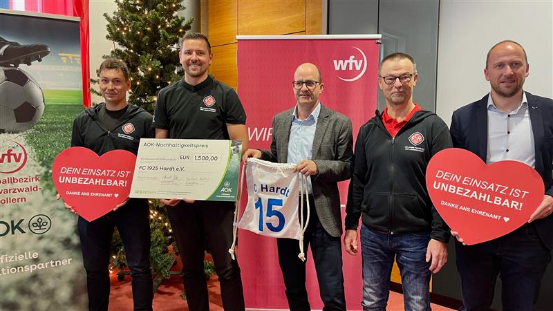 Der FC 1925 Hardt e.V. ist der Gewinner des AOK-Nachhaltigkeitspreises für den Fußballbezirk Schwarzwald/Zollern. Die AOK Neckar-Alb und die AOK Schwarzwald-Baar-Heuberg haben den Preis in diesem Jahr erstmals ausgelobt. Die Auszeichnung ist mit 1.500 Euro dotiert und wurde am Wochenende im Rahmen der Ehrenamtsveranstaltung des Württembergischen Fußballverbands im Bezirk Schwarzwald/Zollern in Rottweil feierlich überreicht.