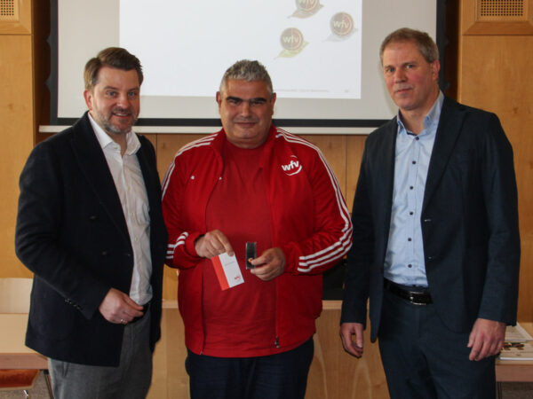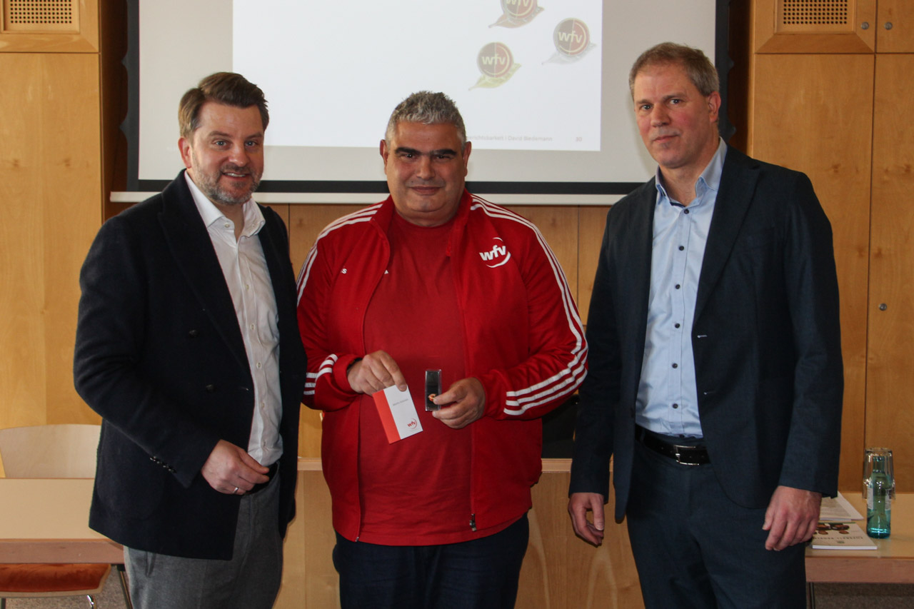Zum Auftakt informierte Dr. Florian Bollacher, wfv-Vizepräsident, über aktuelle Entwicklungen auf DFB- und Verbandsebene. Gemeinsam mit Müller-Metge ehrte Dr. Bollacher Efthimios Chouridis, Sportrichter aus dem Bezirk Enz/Murr, mit der Verbands-Ehrennadel in Bronze.