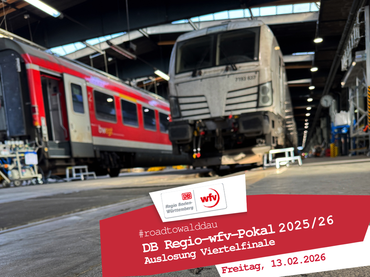 Die nächste Etappe im DB Regio-wfv-Pokal steht im Februar an. Wo sonst ganze Züge gewartet und gereinigt werden, hoffen die letzten acht im Wettbewerb verbliebenen Vereine auf Glücksmomente bei der Auslosung. Am Freitag, 13. Februar 2026, werden die Viertelfinal-Duelle im DB Werk Stuttgart Stadtpark ermittelt.