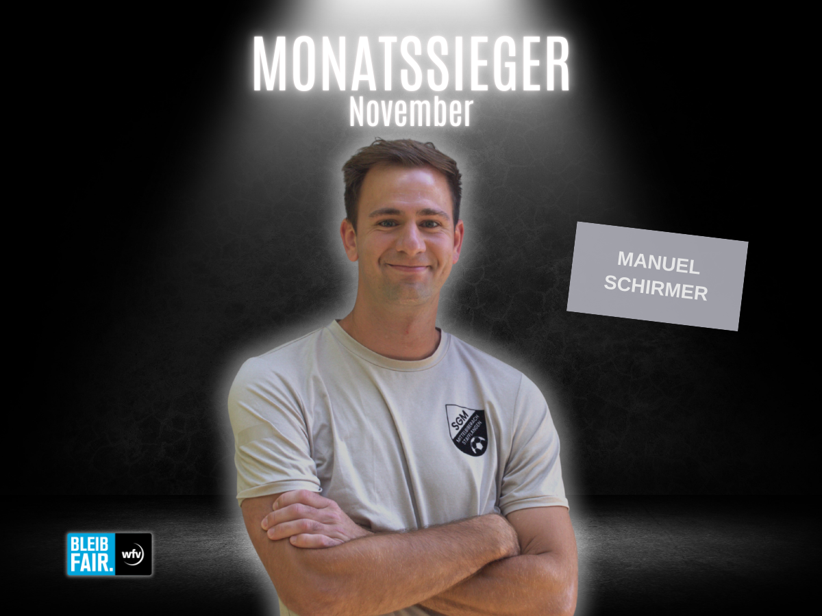 Manuel Schirmer, Stürmer der SGM Mittelbiberach/Stafflangen, ist unser BLEIB FAIR-Monatssieger November! Der 27-Jährige setzte sich im Online-Voting gegen Anja Link (Spfr Widdern) und Ugur Capar (Türkspor Stuttgart) durch.
