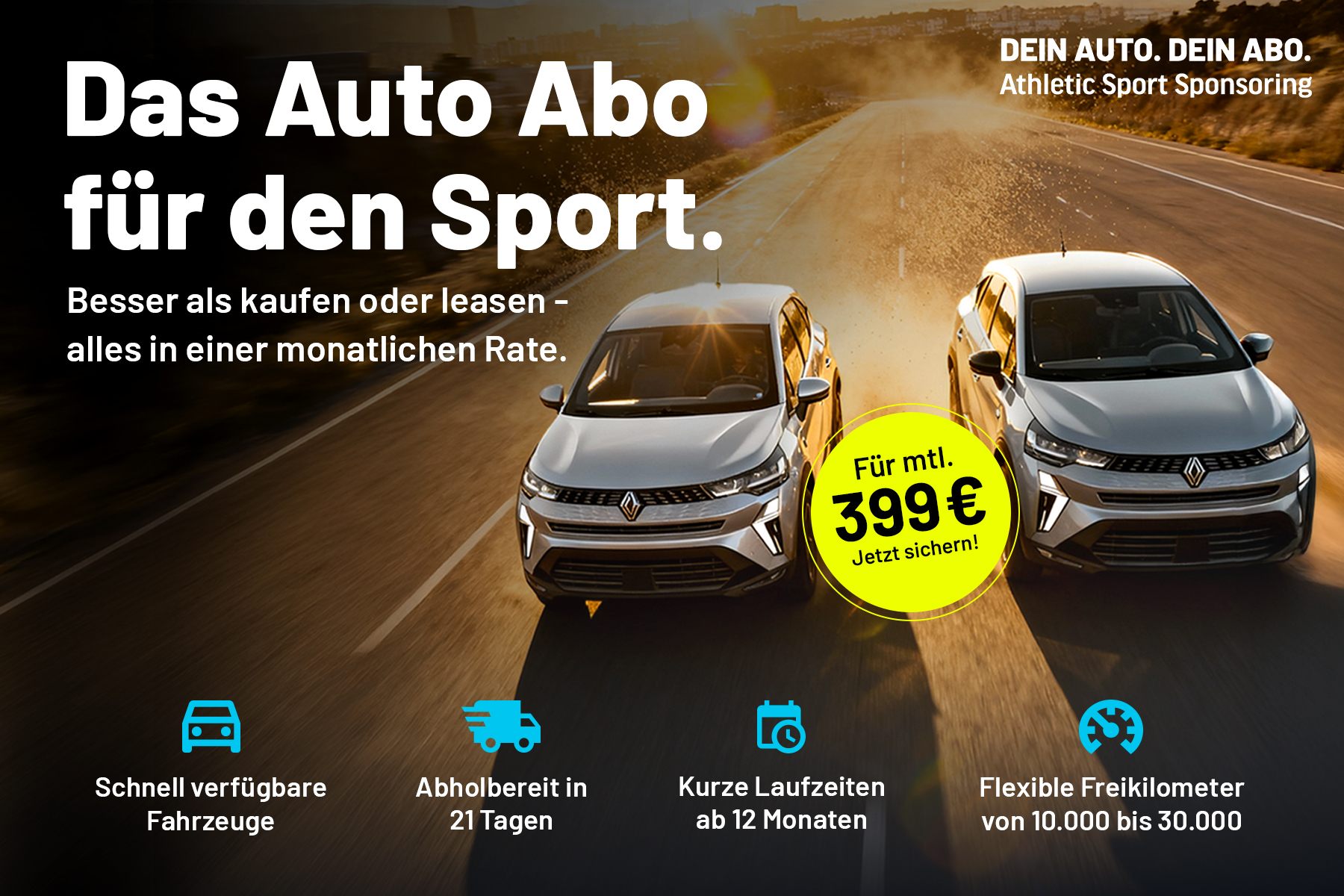 Seit 28 Jahren Partner des Sports – und heute dein Partner für neue Wege: Mit dem Renault Auto Abo gibt es für euch nun ein exklusives Angebot von Athletic Sport Sponsoring.