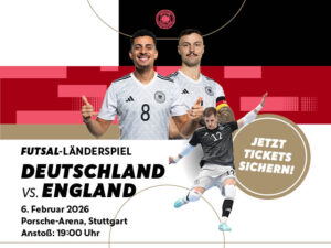 Das erste Highlight der Deutschen Futsal-Nationalmannschaft im Jahr 2026 steht fest. Am Freitag, 6. Februar 2026, trifft das Team von Bundestrainer Marcel Loosveld in Stuttgart auf England. Anpfiff in der Stuttgarter Porsche Arena ist um 19 Uhr. Tickets für das Spiel sind ab sofort im DFB-Ticketshop erhältlich.