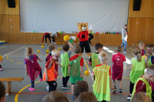 Eine große Überraschung gab es am Ende der Veranstaltung, als Willi, das Maskottchen des Fußballbezirks Schwarzwald, vorbeischaute und mit den Kindern Ballabwerfen spielte.