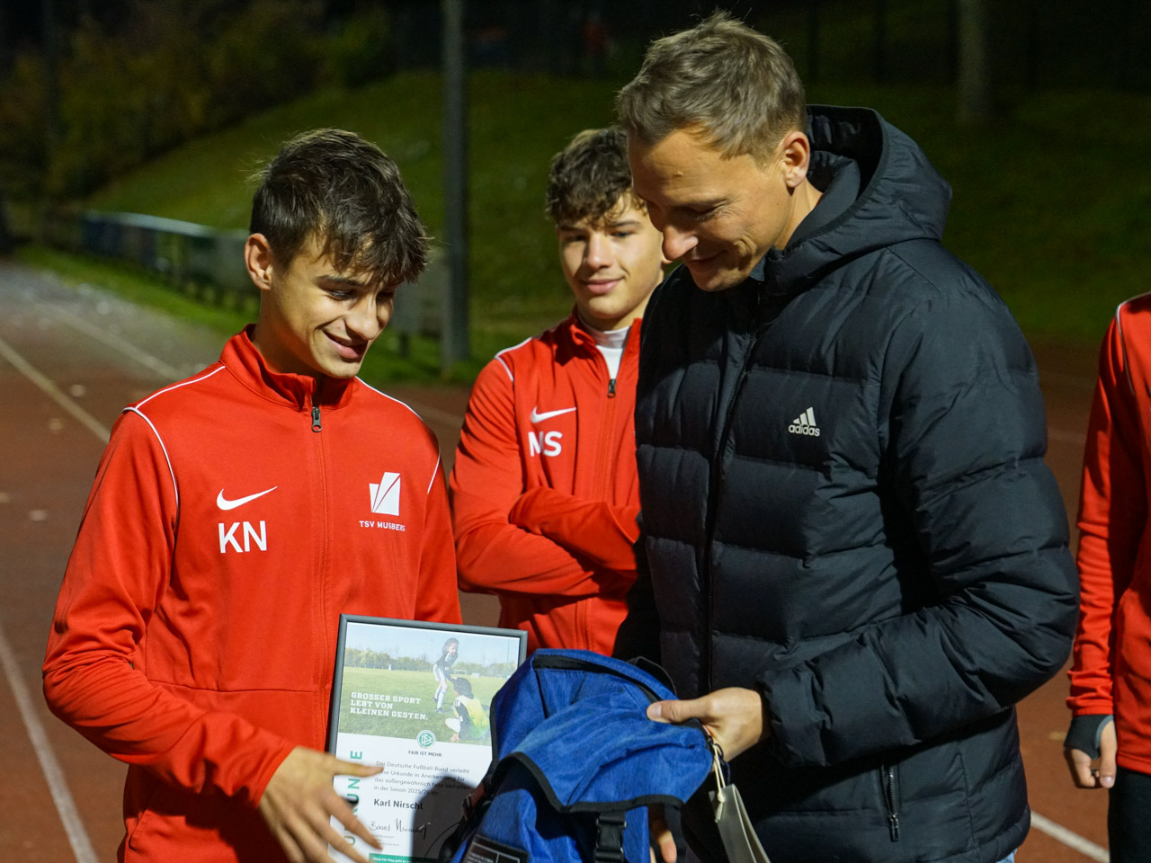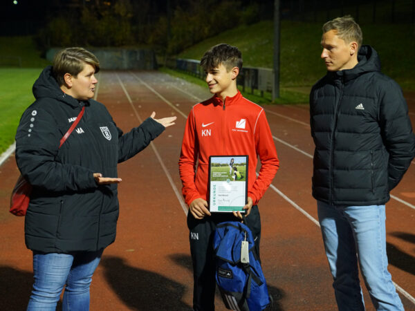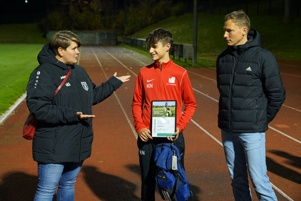Martin Petersen lobte den Musberger Kicker: „Du hast in einem emotionalen Moment einen kühlen Kopf bewahrt und dich vorbildlich verhalten. Faire Sportsmänner brauchen wir –weiter so!“ Auch Michaela Adam, die das Spiel des TSV Musberg Ende September geleitet hatte, bedankte sich noch einmal für die Rückendeckung: „Es war ein heißes Spiel und es ging ums Weiterkommen im Bezirkspokal. Wenn du eine Entscheidung nicht verstanden hast, dann hast du mich nicht angeschrien, sondern nachgefragt. So ein Verhalten habe ich in dieser Altersklasse bisher selten erlebt.“