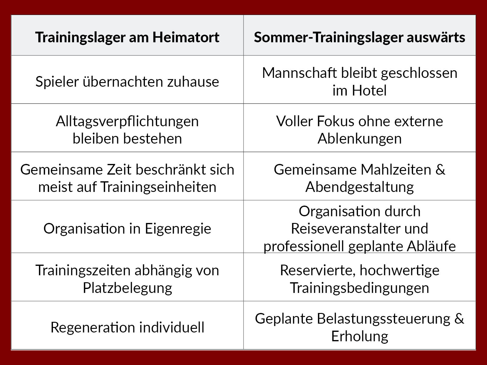 Auch im gewohnten Umfeld lassen sich intensive Trainingseinheiten durchführen. Doch der Alltag bleibt präsent: Termine, Verpflichtungen und Wege nach Hause unterbrechen die Konzentration. Ein externes Sommer-Trainingslager schafft hier andere Voraussetzungen. Die Mannschaft ist über mehrere Tage zusammen, der Fokus liegt klar auf dem Sport. Gerade bei neuen Spielsystemen oder taktischen Abläufen kann dieser konzentrierte Rahmen hilfreich sein.