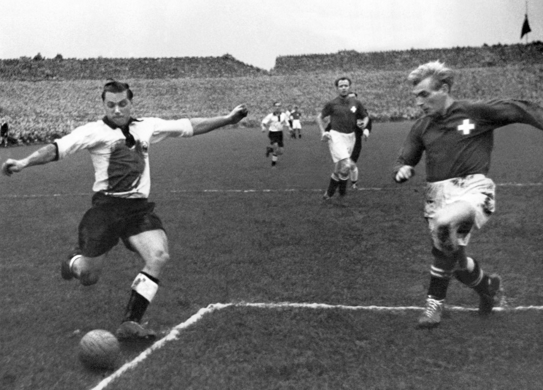 Die deutsche Mannschaft stürmt, während die Schweiz erfolgreich das eigene Tor verteidigt – bis zur 42. Spielminute. Ein Schuss des Kaiserslauterers Ottmar Walter wird von einem Schweizer Feldspieler mit der Hand abgewehrt. Den folgenden Elfmeter verwandelt der Bremer Herbert Burdenski zum 1:0. Bei diesem Ergebnis bleibt es bis zum Ende dieses historischen Spiels.